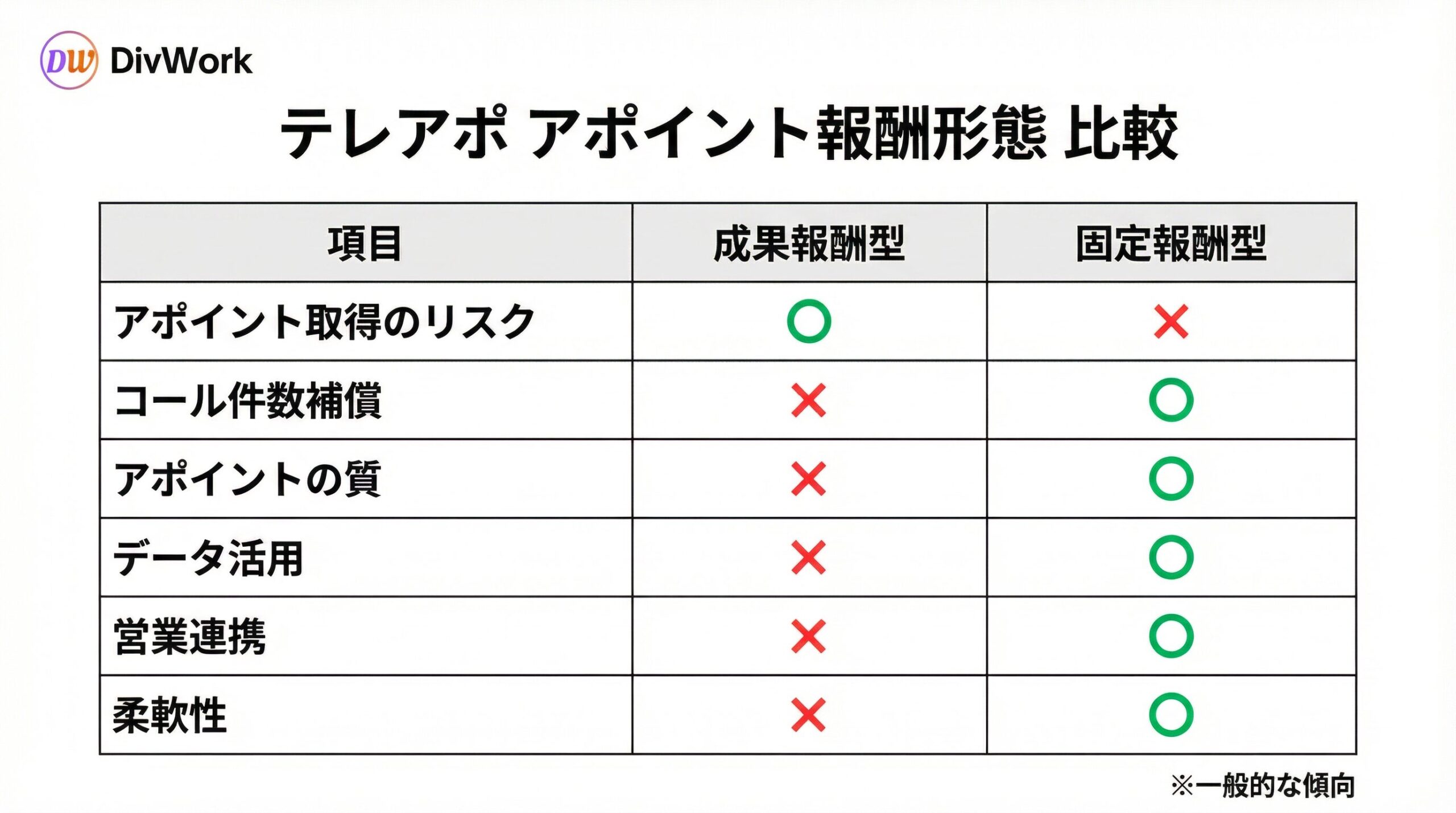 テレアポ代行を検討する際、よく比較されるのが「固定報酬 テレアポ」と「成果報酬 テレアポ リスク」です。結論から言うと、受注につながる新規開拓を“仕組み化”したいなら「テレアポ代行 固定報酬」がおすすめです。理由は、固定報酬の方が「実行→検証→改善」を回しやすく、データドリブンテレアポを活用して成果を伸ばせるからです。 [Source](https://divwork.co.jp/)